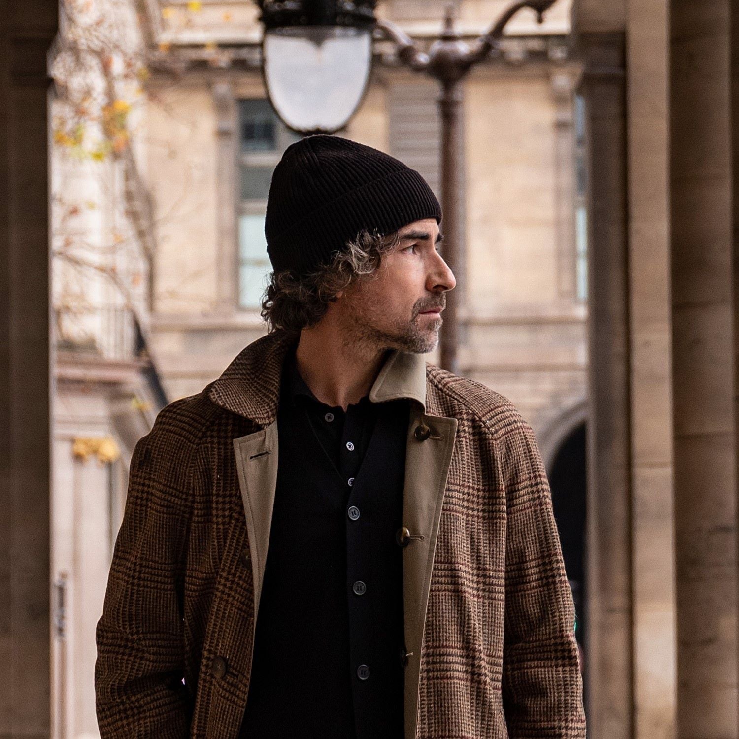 Iconic English-style walking cape. It's a very easy-to-wear garment, featuring a large, full-circle cape, well-fitted over the shoulders, and a collar. It features an exposed button closure, a single-breasted design, and two waterproof front pockets. The cape also has a detachable hood. The interior is lined with the iconic tartan cotton lining. The hem of the cape features buttons and eyelets to adjust the closure around the wrist, creating a sleeve effect, ideal for windy weather.